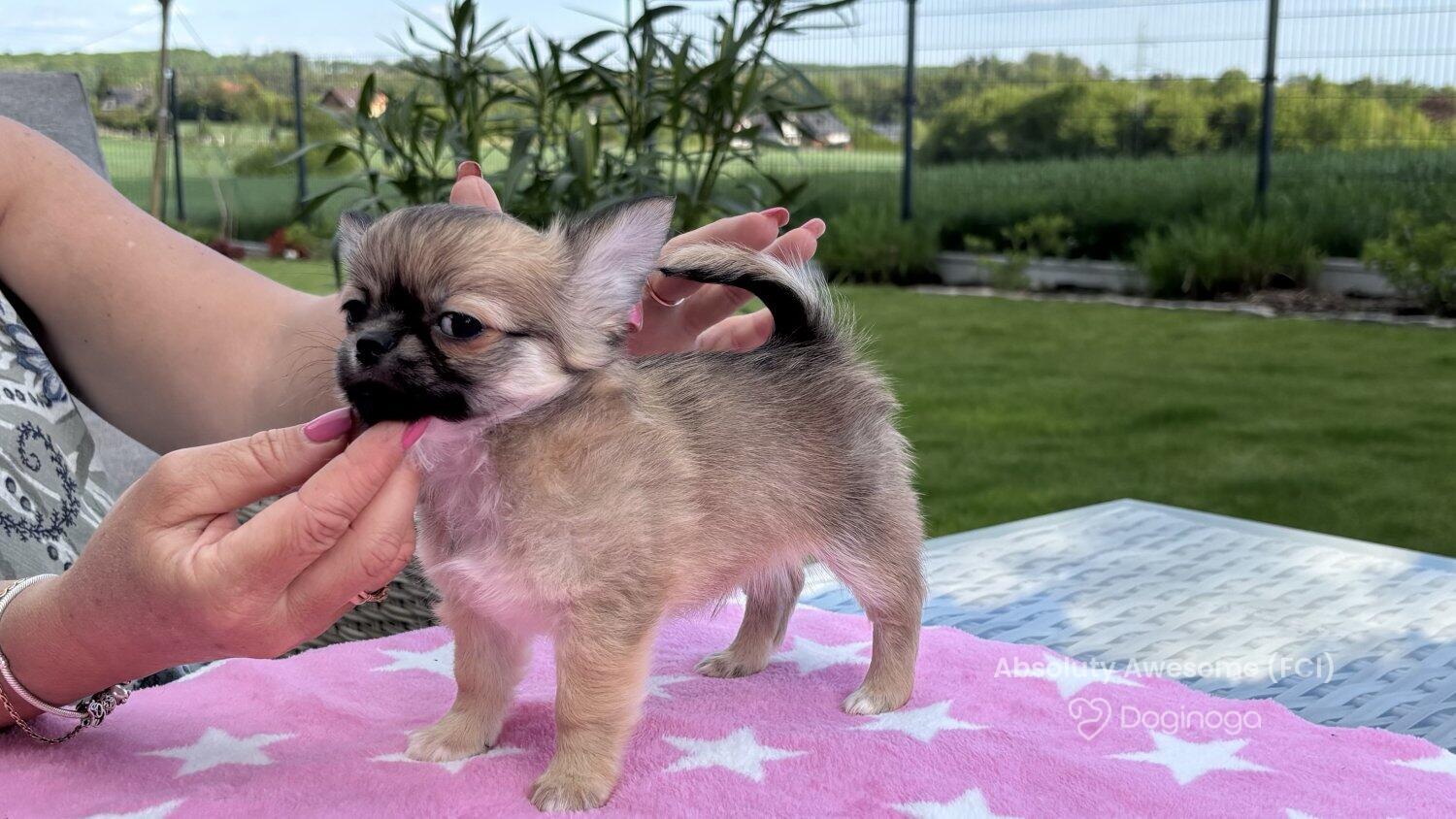 Chihuahua krótkowłosyBardzo kontaktowy, uwielbiający towarzystwo człowieka, z wiecznie merdającym ogonkiem. Ciekawski i rezolutny chłopak, otwarty na ludzi. Docelowa waga: do 3 kg. Straszny przytulak — najchętniej cały czas siedziałby na kolanach :-)