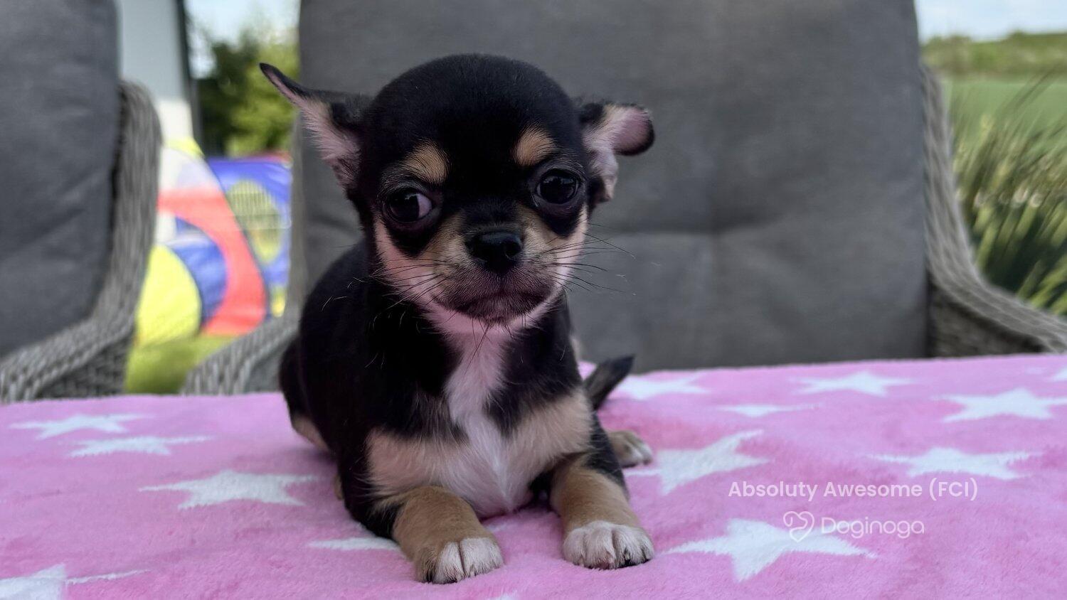 Chihuahua krótkowłosyWesoły łobuziak, rozkręcający imprezę z rodzeństwem. :-) Wszędobylski, ciekawski w stosunku do obcych, z dozą nieufności. Potrzebuje trochę czasu, by przekonać się do nowej osoby. Waga w jego dorosłym życiu nie powinna przekraczać 2,7 kg. Po więcej szczegółów zapraszam do kontaktu.