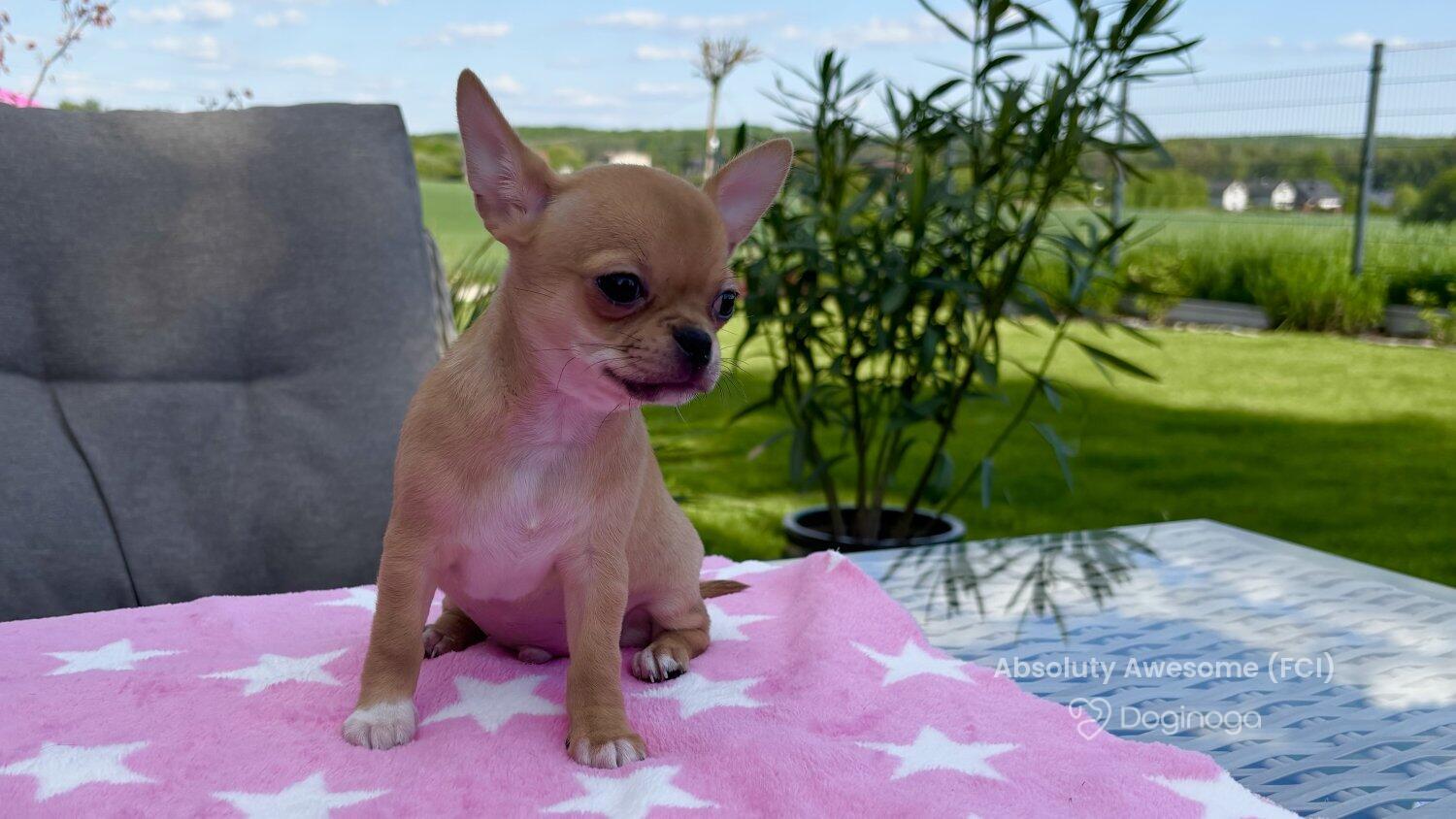 Chihuahua krótkowłosyUwielbia jeść — i to widać od razu po pełnym brzuszku :-) Do ludzi podchodzi ostrożnie, z lekką nieufnością, ale gdy już się go przekona, zamienia się w straszną przylepę. Wielkością zdecydowanie bliżej mu będzie do 3 kg w wieku dorosłym. Wśród rodzeństwa to łobuziak z ogromnymi pokładami energii. Uwielbia psoty, ale kiedy przychodzi pora spania, nic go już nie ruszy ;-) Po więcej szczegółów zapraszam do kontaktu.