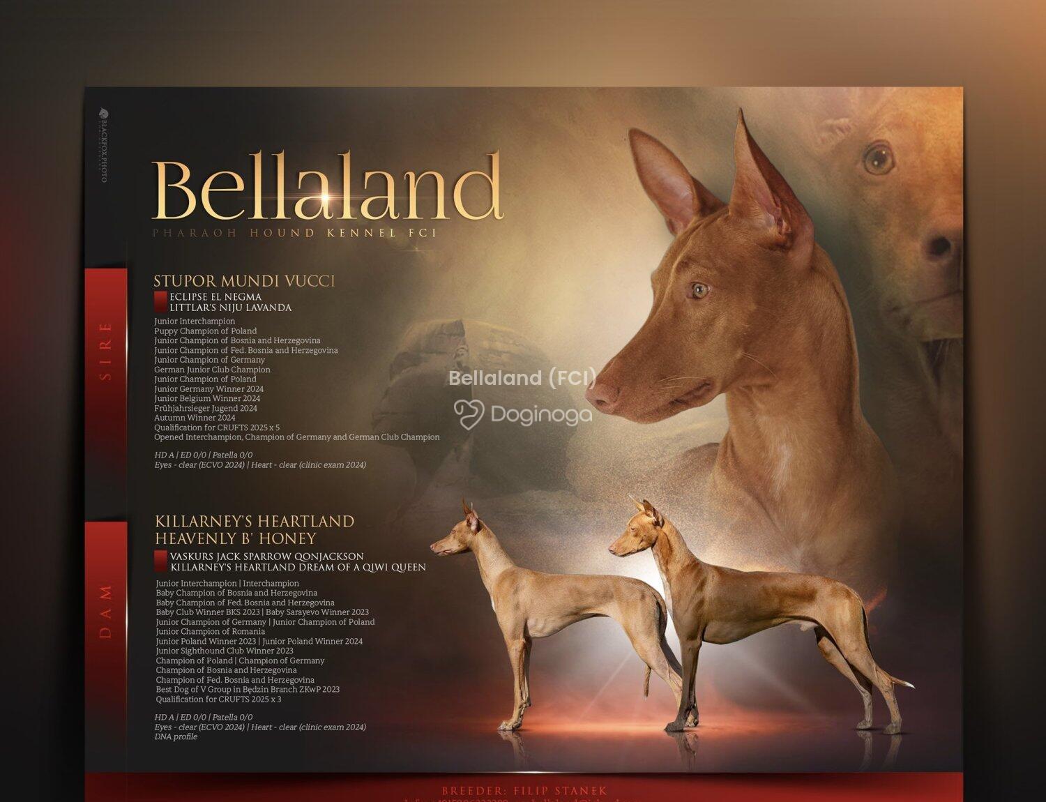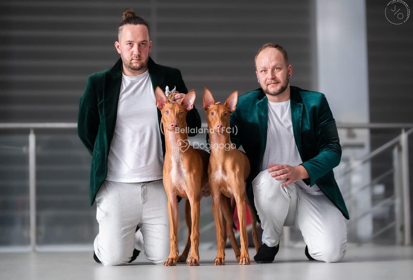 Witajcie w naszym świecie! Od 2021 roku prowadzimy małą, domową hodowlę psów ras: Cocker Spaniel Angielski oraz Pies Faraona. Naszym celem jest powoływanie na świat jak najlepszych szczeniąt pod względem eksterieru, zdrowia i charakteru. Przykładamy bardzo dużą wagę do prawidłowej socjalizacji i żywienia naszych psów. To członkowie naszej rodziny, z którymi spędzamy każdą wolną chwilę. Ich zdrowie, szczęście i dobra kondycja są dla nas najważniejsze. We wrześniu 2021 roku w naszym domu pojawił się nasz pierwszy wspólny pies - Bella, rasy Cocker Spaniel Angielski. To właśnie od niej zaczęła się nasza kynologiczna pasja. W kwietniu 2022 roku pojechaliśmy na naszą pierwszą wystawę w Lingen, gdzie Bella zdobyła tytuł BOB Junior, a następnie, podczas finałów wystawy, zajęła 3. miejsce w konkurencji Junior Best in Show. Ten moment wielkiej radości przewrócił nasze poukładane życie do góry nogami. Zaczęliśmy pojawiać się na coraz większej liczbie wystaw i planować kolejne wyjazdy. Poznawaliśmy wielu ciekawych i wartościowych ludzi. Rok później, we wrześniu 2022 roku, w naszym życiu pojawił się kolejny cocker — biało-czarna Zoya, nasz mały, radosny promyczek. Pod koniec 2022 roku planowaliśmy powiększyć nasze stado, tym razem spełniając marzenie Filipa o posiadaniu własnego psa. I tak, w styczniu 2023 roku, w naszym domu pojawiła się nowa rasa — Pies Faraona, Hania. Oczywiście nadal kontynuowaliśmy nasze wystawowe podróże, jednak po raz pierwszy wyruszyliśmy w dalsze zakątki Europy. W marcu 2023 roku po raz pierwszy pokazaliśmy nasze psy w Bośni i Hercegowinie. Wyjazdy na wystawy dają nam przyjemność podróżowania, odkrywania i zwiedzania nowych miejsc na naszym kontynencie, a także możliwość prezentowania naszych psów w różnych jego częściach. Rok 2023 zakończyliśmy zadowoleni – i z kolejnym psiakiem w naszym domu. W grudniu dołączył do nas kolejny pies faraona – Vucci. Kolejny rok okazał się dla nas czasem przełomowym. Po raz pierwszy wyruszyliśmy na jedną z największych wystaw na świecie – angielski Crufts. Naszym celem było zobaczenie, jak wygląda tak prestiżowe wydarzenie, i spędzenie czasu z naszymi kynologicznymi przyjaciółmi. Wielką radością i zaszczytem było dla nas zajęcie przez Zoyę pierwszego miejsca w klasie Special Working. W tym samym czasie w naszym domu pojawił się kolejny cocker – Magnus, który zaledwie miesiąc później zdobył na Światowej Wystawie Psów Rasowych w Zagrzebiu tytuł Zwycięzcy Świata Młodszych Szczeniąt. Zapraszamy Was do odkrywania naszego świata i stania się jego częścią. Michał i Filip Hodowla Bellaland