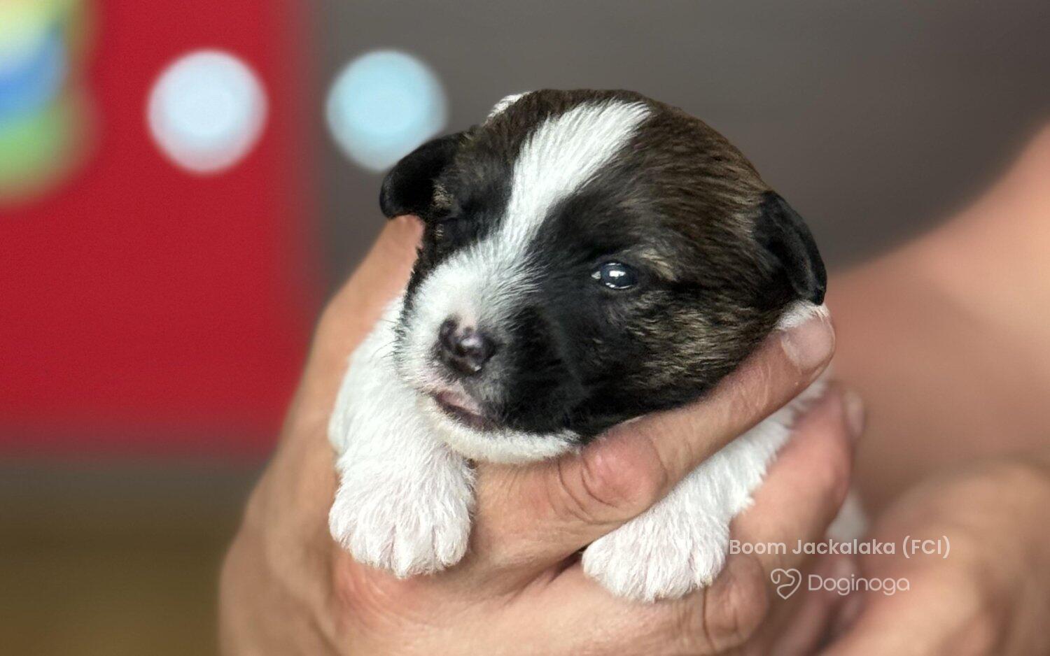 Jack Russell terrierPiękny, silny i ruchliwy chłopak. Doskonale umaszczony. Bardzo towarzyski – wręcz domaga się atencji. Z pewnością wyrośnie na wspaniałego towarzysza wszelkich zabaw. Prawidłowo się rozwija i przybiera na wadze. Typ raczej małego łobuziaka. Odważny i szczęśliwy. Idealny dla aktywnej rodziny.