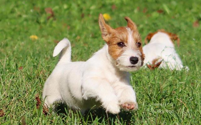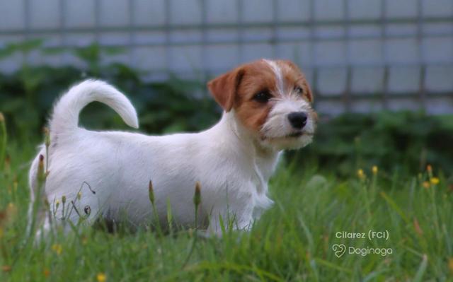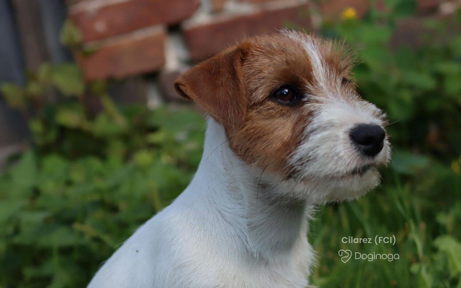 Piesek o włosie złamanym. Dobrze zbudowany, zgrabny przystojniak JRT. Często zadumany, przygląda się światu, ale poza tym to żywy, energiczny, typowy przedstawiciel rasy.