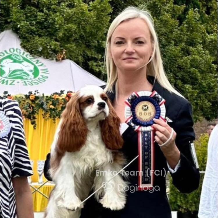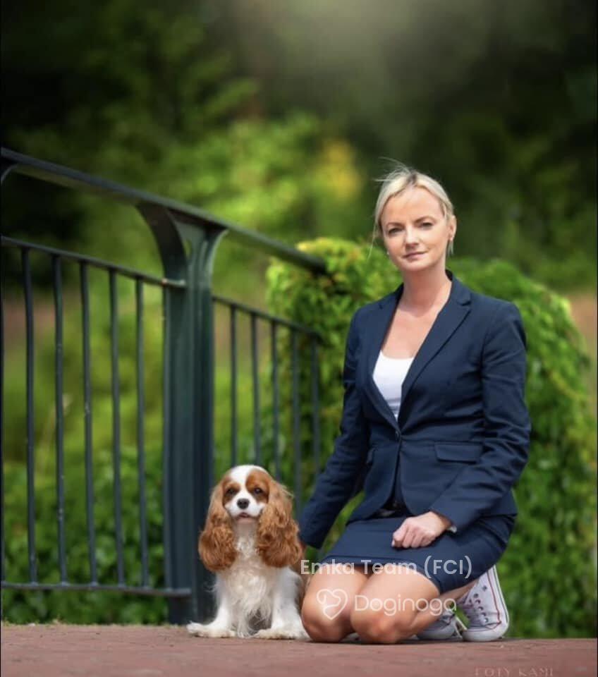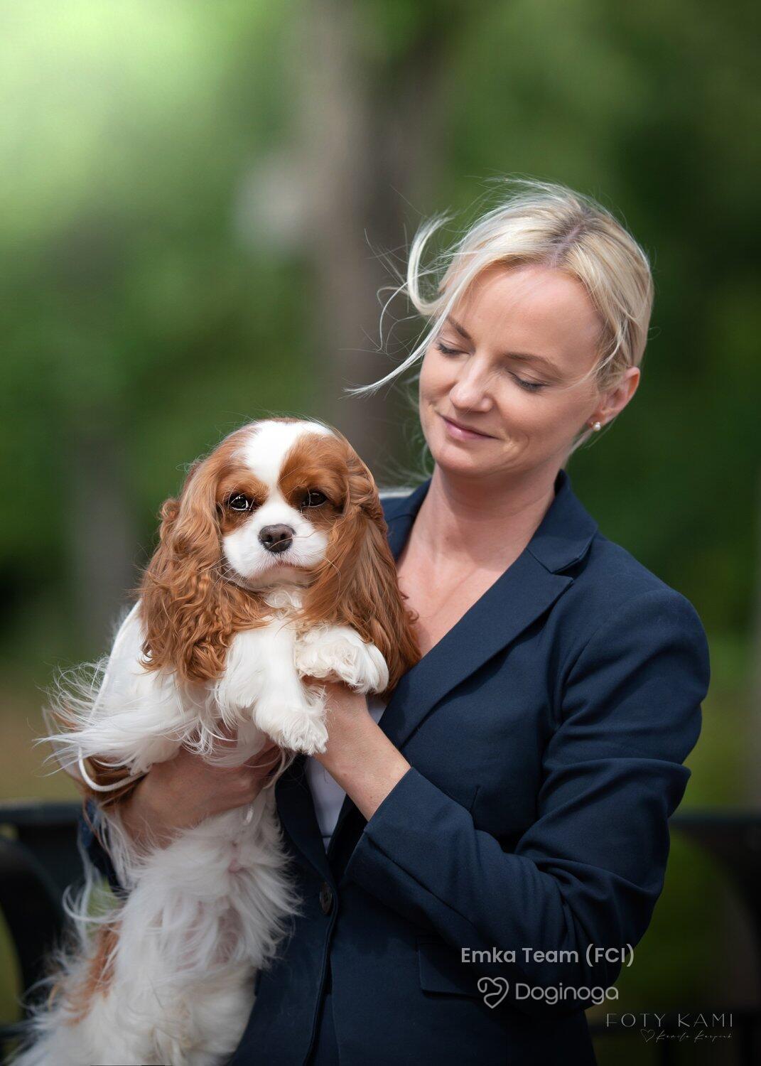Hodowla Emka Team FCI powstała z miłości do rasy Cavalier King Charles Spaniel – i z głębokiego przekonania, że psy zasługują na życie pełne bliskości, spokoju i szacunku. Wszystko zaczęło się od jednej wyjątkowej suczki, która na zawsze odmieniła nasze spojrzenie na świat psów – przynosząc nie tylko radość i czułość, ale też poczucie odpowiedzialności za każdą kolejną historię, która zacznie się właśnie u nas. Od tamtej pory budujemy hodowlę opartą na wartościach, a nie na liczbach. Stawiamy na jakość, nie ilość – każdy miot jest przemyślany, poprzedzony analizą linii hodowlanych, badań genetycznych i planem, który ma przynieść nie tylko piękno zewnętrzne, ale też stabilność charakteru i zdrowie. Nasze szczenięta od pierwszych dni otoczone są troską i spokojem. Stosujemy neurostymulację noworodków (ENS), która wspiera rozwój układu nerwowego, odporność oraz odporność na stres w dorosłym życiu. Prowadzimy również świadomą socjalizację, dostosowaną do wieku – maluchy mają kontakt z różnymi powierzchniami, dźwiękami, zapachami, a także człowiekiem w różnych sytuacjach. Dzięki temu są przygotowane do życia w świecie ludzi – nie tylko odważne, ale też wyważone i pełne ufności. Wierzymy, że etyka w hodowli to codzienność: czystość, dobra dieta, ruch, troska o matkę szczeniąt i kontrola weterynaryjna to dla nas nie obowiązek, lecz norma. Psy żyją z nami, nie obok nas – są członkami rodziny. Ich komfort, emocje i dobrostan to fundament wszystkiego, co robimy. Jesteśmy aktywnym uczestnikiem wystaw psów rasowych, zarówno krajowych, jak i międzynarodowych. Nasze psy są oceniane przez sędziów zgodnie z wzorcem FCI, a zdobyte tytuły są wynikiem pracy, ale nigdy celem samym w sobie. Ważniejsze jest dla nas to, jak pies się czuje – nie tylko na ringu, ale przede wszystkim poza nim. Nieustannie rozwijamy się jako hodowcy – uczestniczymy w szkoleniach, webinarach i wydarzeniach kynologicznych. Wierzymy, że hodowla to nie tylko genetyka i pokazy – to przede wszystkim odpowiedzialność, pokora i gotowość do nauki każdego dnia. Z rodzinami naszych szczeniąt budujemy relacje pełne wsparcia i zaufania. Jesteśmy obecni przed, w trakcie i po odbiorze – dzielimy się wiedzą, pomagamy w trudniejszych momentach, cieszymy się z sukcesów. Każdy Cavalier z przydomkiem Emka Team FCI to dla nas historia, której jesteśmy częścią – od pierwszego oddechu... na zawsze.