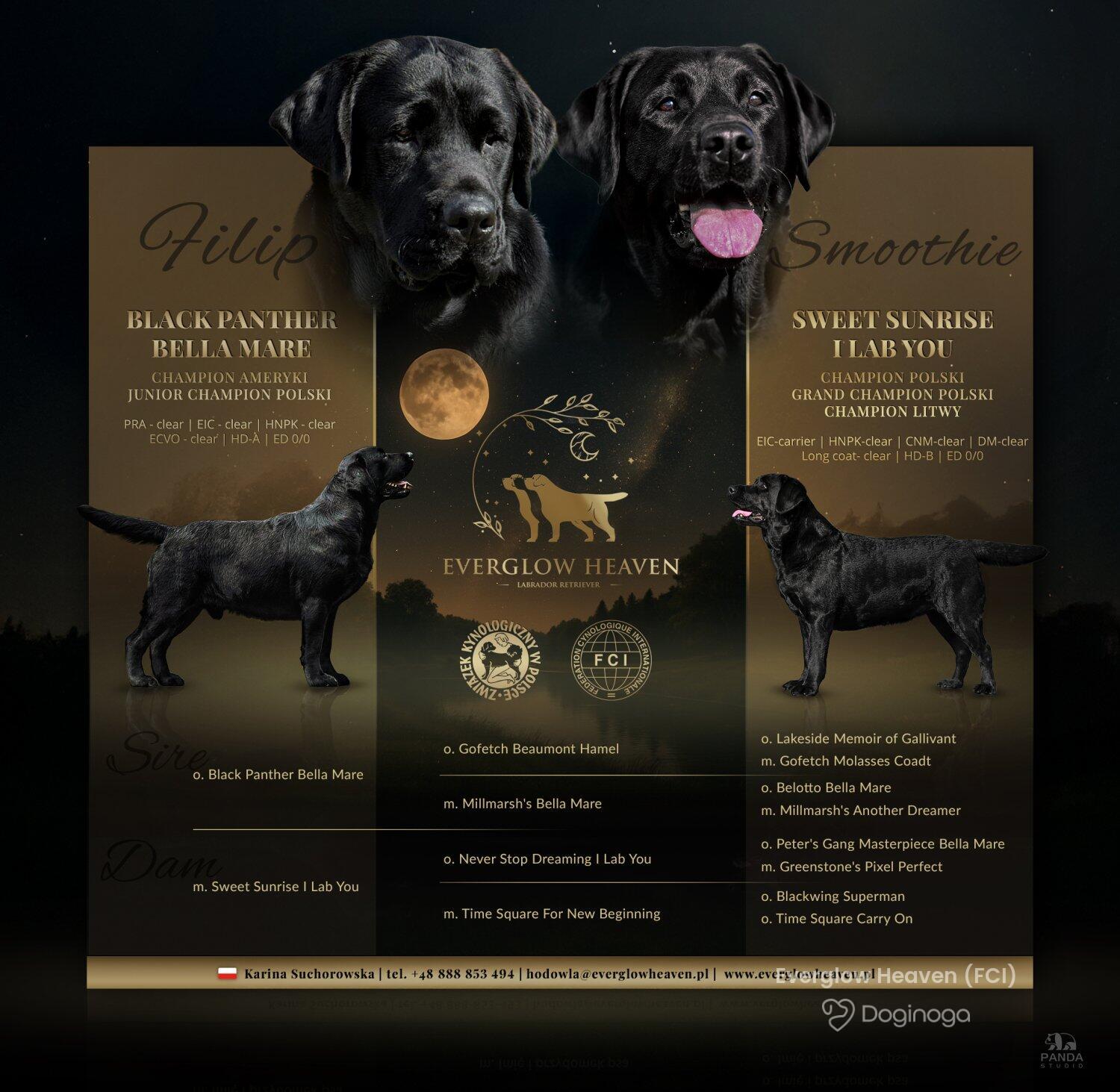 Hodowla psów rasy Labrador Retriever, która powstała z miłości do czworonożnych przyjaciół oraz pasji do tej wyjątkowej rasy. Nasza hodowla działa pod patronatem Związku Kynologicznego w Polsce, oddział w Będzinie, będącego członkiem Międzynarodowej Federacji Kynologicznej (FCI). Znajdujemy się w Polsce, w województwie śląskim, w miejscowości Dąbrowa Górnicza. Początek przygody z labradorami Miłość do psów była w naszej rodzinie od zawsze, ale prawdziwa fascynacja labradorami zaczęła się w 2016 roku, gdy w naszym życiu pojawiła się Bora z Luxuria Black – nasza pierwsza czekoladowa labradorka. Już wtedy wiedziałam, że znalazłam rasę, która idealnie odpowiada mojemu charakterowi i stylowi życia. To od niej wszystko się zaczęło – to ona była inspiracją do dalszej pracy z psami tej rasy. Nazwa hodowli – Everglow Heaven Nazwa Everglow Heaven, czyli „Wiecznie świecące niebo”, odzwierciedla naszą miłość do psów, które wnoszą blask i radość do naszego życia. Dla nas labradory to nie tylko psy – to członkowie rodziny, których obecność rozświetla nawet najbardziej pochmurne dni. Rozwój hodowli i miłość do wystaw W 2022 roku nasza rodzina powiększyła się o kolejną suczkę – Sweet Sunrise I Lab You, pochodzącą z fantastycznej hodowli, która otworzyła przed nami świat wystaw psów. Wspólne wyjazdy, sukcesy na ringu i poznawanie nowych ludzi sprawiły, że wystawy stały się naszą nową pasją. Rok później dołączyła do nas kolejna suczka z tej samej hodowli – Lime Lollipop. To właśnie one stanowią fundament naszej hodowli i to z nimi budujemy naszą przyszłość. Nasze podejście Everglow Heaven to hodowla, w której psy są przede wszystkim członkami rodziny. Dbamy o ich zdrowie, rozwój i socjalizację od pierwszych dni życia. Każdy szczeniak, który opuszcza nasz dom, jest nie tylko zdrowy i zadbany, lecz także gotowy do życia w nowej rodzinie – z pełnym bagażem miłości, którą mu przekazaliśmy. Zapraszamy do kontaktu i odwiedzin. Chętnie opowiemy więcej o naszej pasji i podzielimy się wiedzą na temat rasy Labrador Retriever. Jeśli szukasz czworonożnego przyjaciela, który wniesie do Twojego życia radość i oddanie – jesteś we właściwym miejscu!
