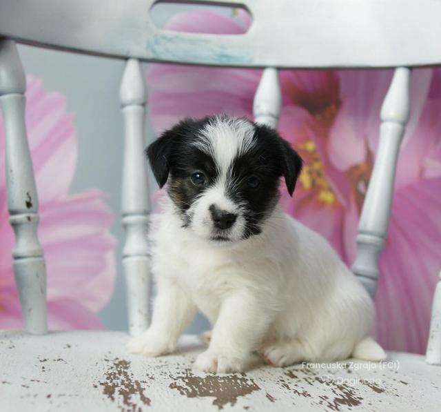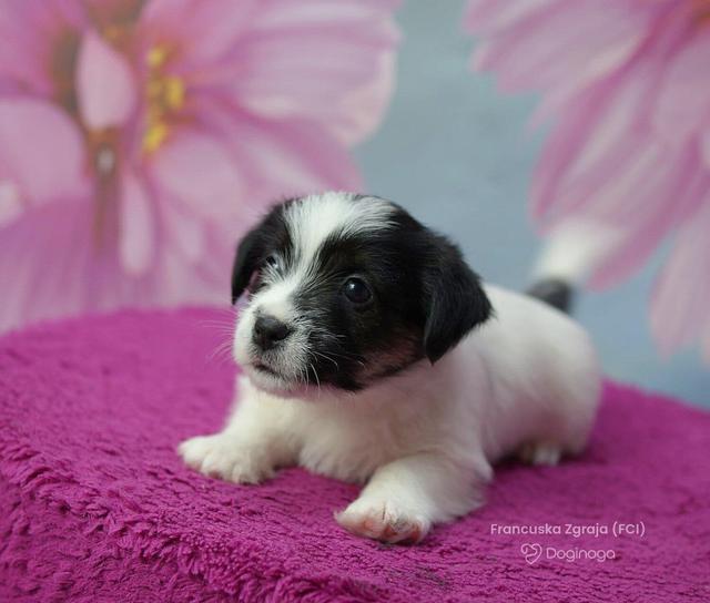 Delicja to suczka o szorstkim włosie i bardzo ładnej budowie. Sunia ma fajny charakter, lubi kontakt z człowiekiem i zabawy. Nauczona korzystać z kuwety oraz podkładów.