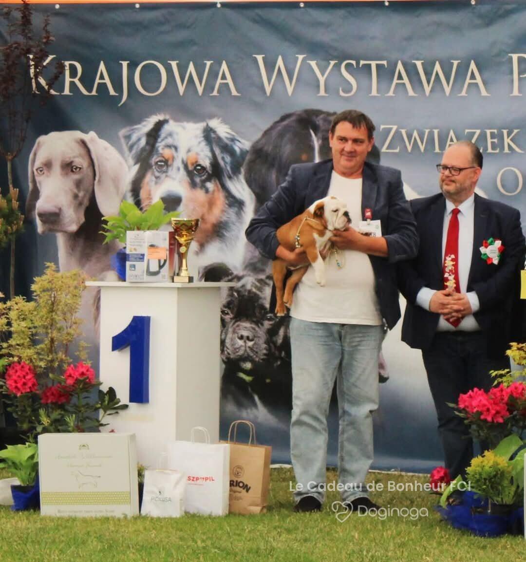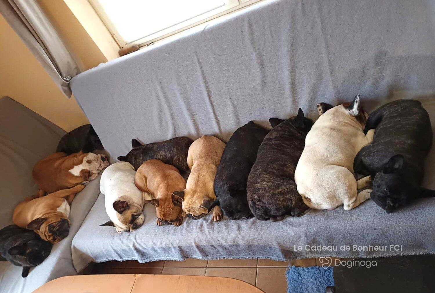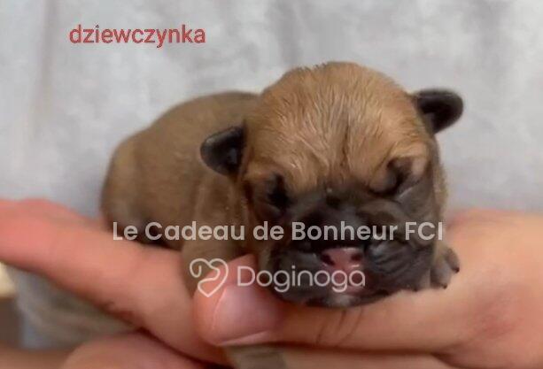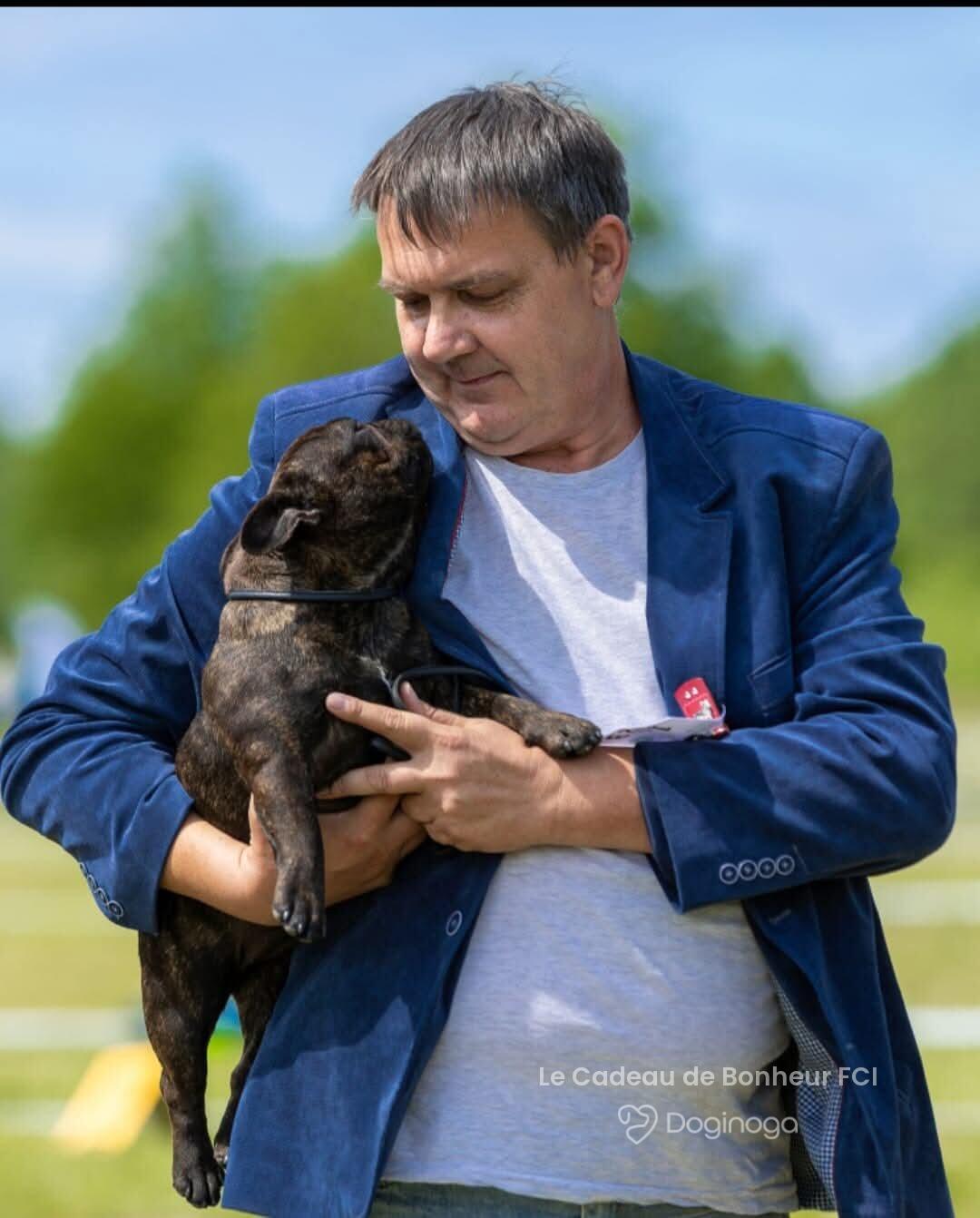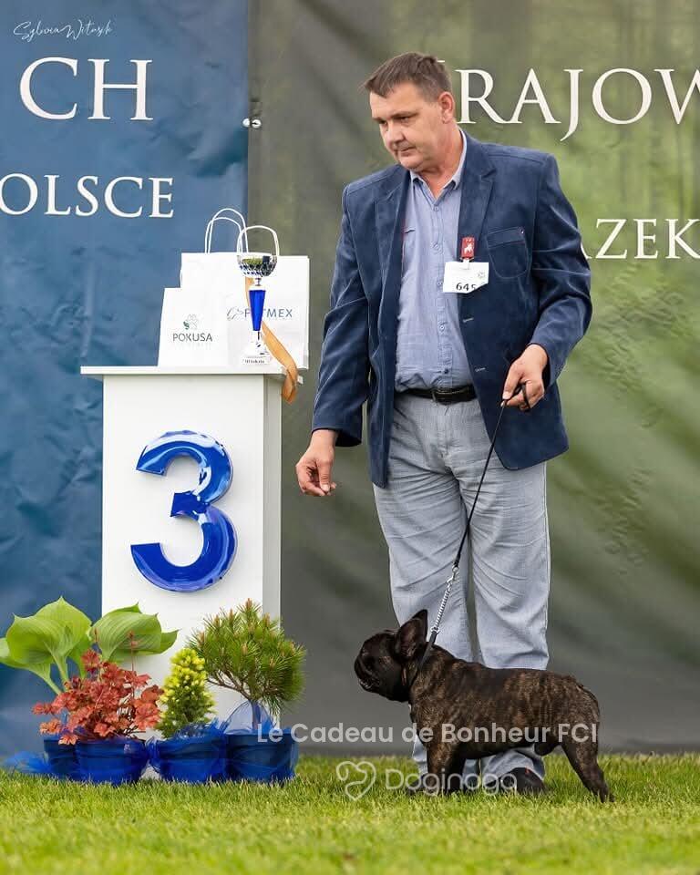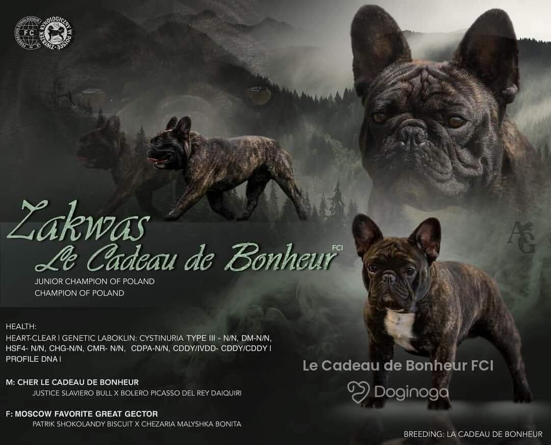 Witamy! 😁 Jesteśmy małżeństwem z 35-letnim stażem i – o dziwo – wciąż się sobą nie nudzimy 😁 Psy kochaliśmy od zawsze. I ja, i mój mąż, i nasz dorosły już syn. Nawet w zamierzchłych czasach mój mąż, jak widać, skutecznie podrywał mnie „na swojego pieska” 😉 Naszą psią miłością są buldogi francuskie. No, nie ma cudowniejszych istotek na świecie. Po prostu nie ma. I tak, 17 lat temu trafiły do naszego domu dwa buldogi z adopcji. Pierwszy to 7-miesięczny nieszczęśnik z pseudohodowli. Wyrwany przez fundację z okropnych warunków – z olbrzymią blizną na głowie, chudziutki, wystraszony, z chorym serduszkiem. Przyrzekliśmy mu, że już nigdy nie będzie musiał się bać i nigdy nie będzie miał pustego brzuszka. Dostał imię Cado – od Le Cadeau de Bonheur („Podarunek Szczęścia”), bo naprawdę był naszym szczęściem. Druga była Coco. Dziewczynka została odnaleziona w torbie, pod ubraniami (prawie uduszona), przy wejściu na prom do Szwecji. Zgodnie z prawem psy z przemytu są usypiane. Ale fundacja walczyła – i Cocosi się udało. Nie zabili jej. Po długiej kwarantannie została naszym drugim szczęściem. Cado był bardzo chory, ale wiedzieliśmy, na co się piszemy. Byliśmy z nim do jego ostatnich chwil… i to właśnie na jego cześć powstała nasza hodowla. Nasza pierwsza hodowlana sunieczka trafiła do nas w 2010 roku. To Lady z Leśnego Potoku FCI, zwana Dusinką, a później Babką Dusinką. Dusinka w zdrowiu przeżyła z nami 12 lat. A od 15 lat takim samym szczęściem są dla nas szczenięta, sukcesy wystawowe, jak i nasi psi weterani ❤️ Kochamy nasze psy – dzielą z nami dom, nasze łóżka i nasze serca. Są naszymi „dzieciakami”, ale szanujemy to, że są psami. Nie karmimy ich łyżeczką, nie stroimy w kokardki – ale staramy się, żeby były szczęśliwymi psami. Dbamy też o to, by były zdrowe. Nasze dzieciaki przechodzą badania serca, badania genetyczne i okresowe kontrole. Wbrew powszechnej opinii o rasie – przez te 15 lat nie zauważyliśmy, by buldogi francuskie były bardziej (lub mniej) chorowite niż inne psy. Każdemu, kto chce kupić nasze szczenięta, powtarzamy, że w pakiecie dostaje całą naszą rodzinę – i właśnie dzięki temu zyskaliśmy tak wielu prawdziwych przyjaciół, na dobre i na złe. I my, i nasze psy kochamy jeździć na wystawy. Nieskromnie przyznajemy się też do wielu sukcesów – zarówno na wystawach krajowych, jak i zagranicznych, również tych rangi światowej. Rok temu do naszej ekipy francuzów dołączył buldog angielski – nasza nowa miłość ❤️ która idealnie zazębia się z tą pierwszą – do francuzów. Pozdrawiamy, Kasia i Marcin