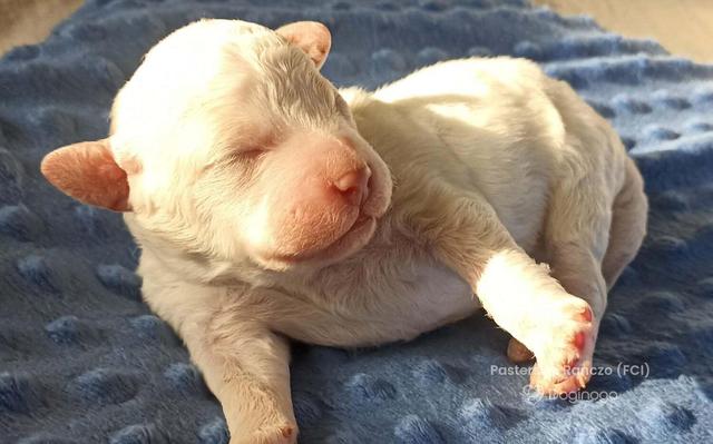 Śliczny piesek, o białym umaszczeniu, po zdrowych przebadanych rodzicach. Wychowywany w domu pełnym miłości i szacunku do zwierząt. Ma kontakt z kotem