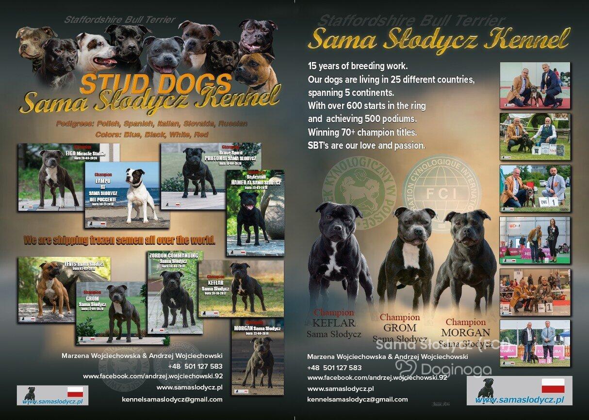 Nasza przygoda z psami rozpoczęła się w 1993 roku, kiedy kupiliśmy naszą pierwszą rottweilerkę. Od tego czasu psy na stałe zagościły w naszym domu. Obecnie nasza miłość do czworonogów znalazła swoje odzwierciedlenie w rasie Staffordshire Bull Terrier. W 2022 roku minęło 15 lat naszej fascynacji SBT, więc postanowiliśmy zrobić małe podsumowanie. 🙂 W tym czasie sprowadziliśmy do naszej hodowli 16 przedstawicieli rasy SBT, by poszerzyć pulę genetyczną na naszej staffikowej scenie. Nasze szczenięta znalazły swoje domy na pięciu kontynentach, w 25 krajach. W ciągu tych 15 lat braliśmy udział w wielu wystawach, które stały się naszą pasją. Ponad 600 razy stanęliśmy w ringu, z czego aż 500 razy na podium: – I miejsce: 325 razy – II miejsce: 154 razy – III miejsce: 61 razy – IV miejsce: 33 razy. Nasze psy zdobyły ponad 70 tytułów championa. Mamy nadzieję, że to jeszcze nie koniec — wciąż podążamy wyznaczoną drogą do celu. 🙂 Może w 2027 roku zrobimy kolejne podsumowanie. ;-)