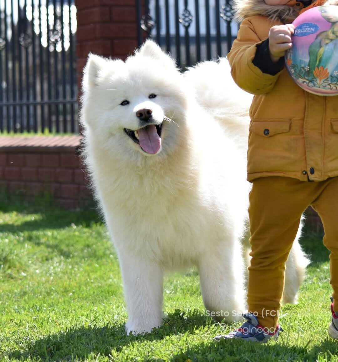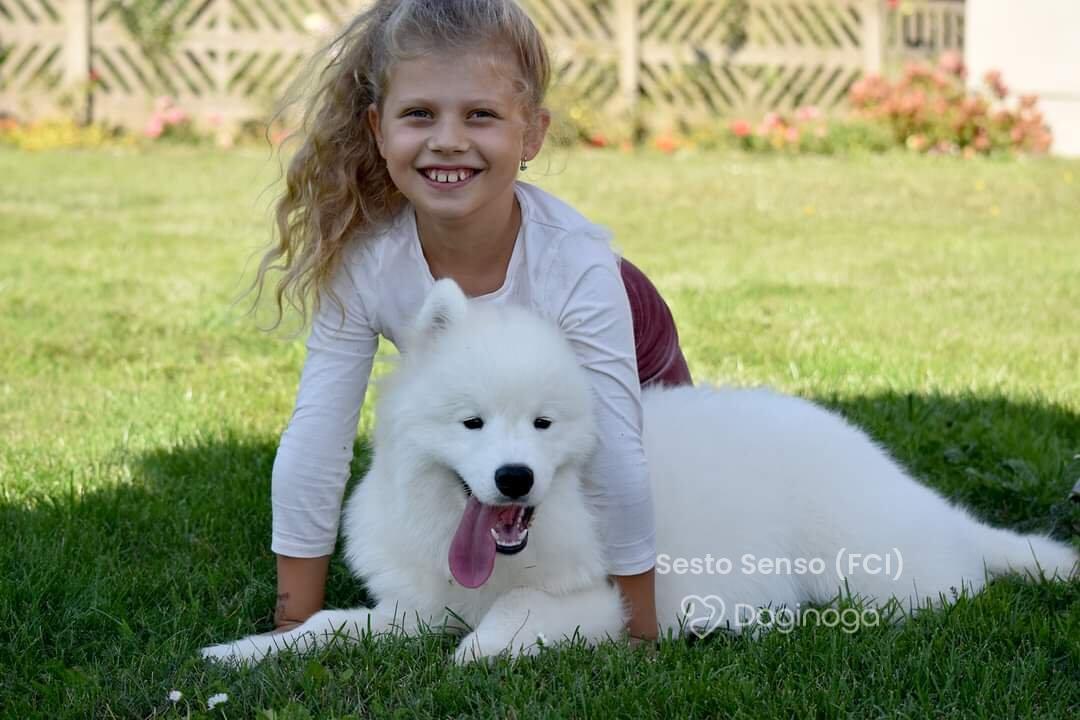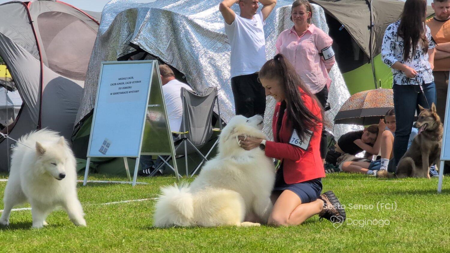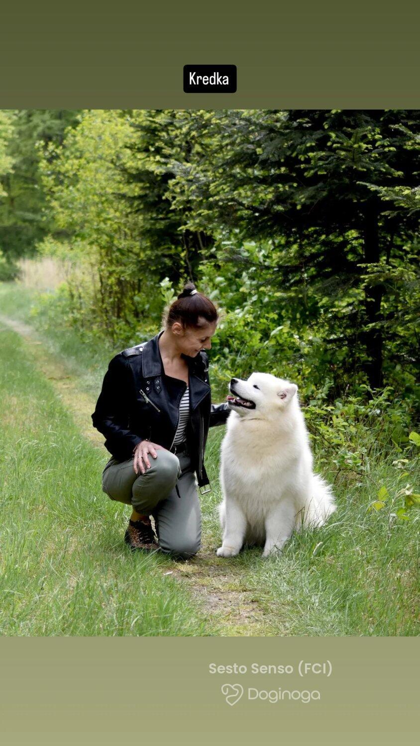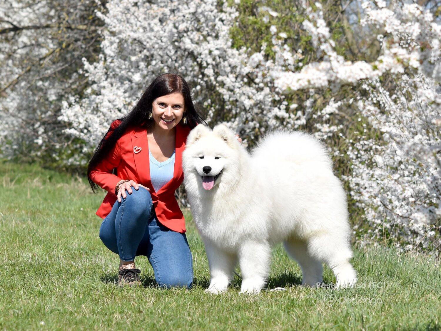 Na jednej z wystaw zobaczyłam psa. Urzekł mnie swoją puszystością, piękną, białą szatą i niesamowicie przyjaznym wyrazem pyszczka :) Okazało się, że to samoyed. Zaczęłam czytać o tej rasie i po cichu marzyć, że kiedyś stanę się właścicielką tej białej kulki :) Moje marzenie spełniło się w maju 2011 roku, kiedy rodzice podarowali mi w imieninowym prezencie KAYLE HONEY The Glow Of The Snowy Star. Moja radość była tak ogromna, jakbym wygrała w totolotka! Miałam swojego pierwszego, upragnionego psa! Kayla stała się oczkiem w mojej głowie. Idealnie do siebie pasujemy :) Kayla bardzo łatwo i szybko nawiązała relację z resztą psów i stała się wspaniałą kompanką dla Bernusi. Ich zabawom nie było końca, a my godzinami mogliśmy obserwować ich wygłupy :) Razem z Kaylą zaczęłyśmy pokazywać się na wystawach. Młodzieżowy Championat Polski Kayla ukończyła w ekspresowym tempie — już w wieku 11 miesięcy otrzymała odpowiednią liczbę nominacji, ku mojej wielkiej dumie i radości :) Samoyedy okazały się tak rewelacyjną rasą, że zapragnęłam mieć jeszcze jedną sunię — towarzyszkę dla Kayli. I tak w maju 2012 roku trafiła do nas Sonata Arctica EILEENA O’AZZIS. Eli, przeciwieństwo Kayli, jest istną oazą spokoju, która podbiła moje serce w mgnieniu oka. Mówi się, że po zakupie trzeciego czy czwartego psa pojawienie się kolejnych to już tylko kwestia czasu. U nas właśnie tak się stało. Psy okazały się pełnić w naszym życiu tak znaczącą rolę, dawać nam tyle szczęścia i radości, że zmieniliśmy bardzo wiele, aby móc dać im odpowiednie warunki do życia, otoczyć je stałą opieką i dać im tyle miłości, ile potrzebują :) Nie wyobrażam sobie już życia bez nich — i nie pamiętam nawet, jakie nudne musiało być ono wcześniej, zanim pojawiły się w nim psy!! :)