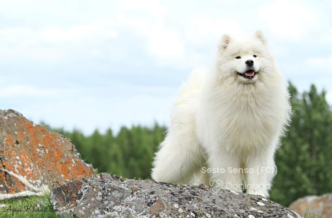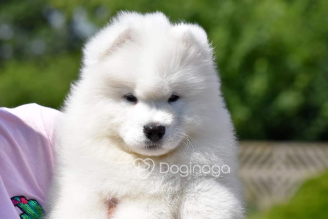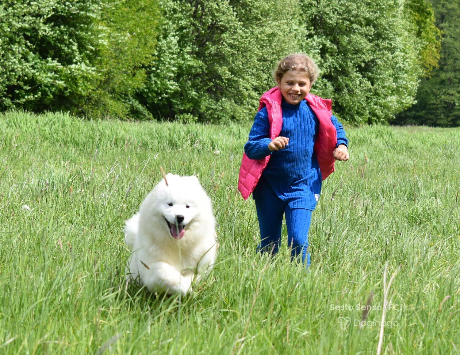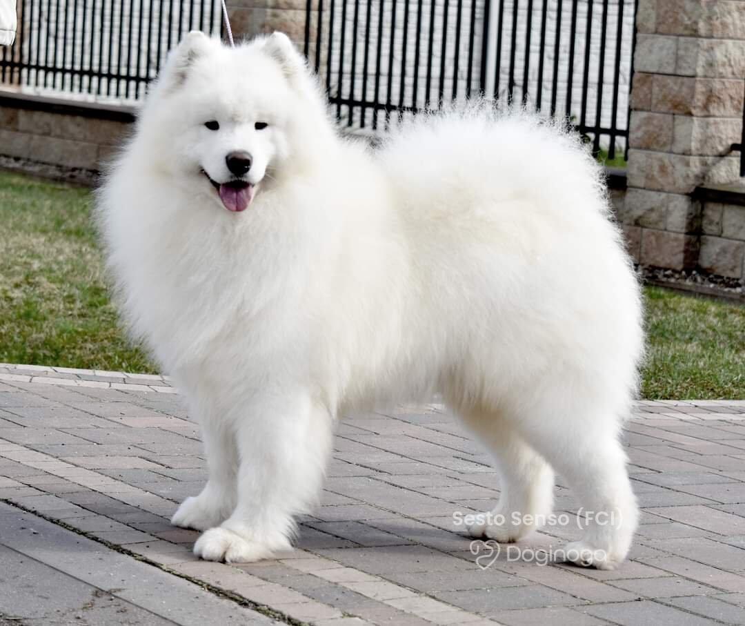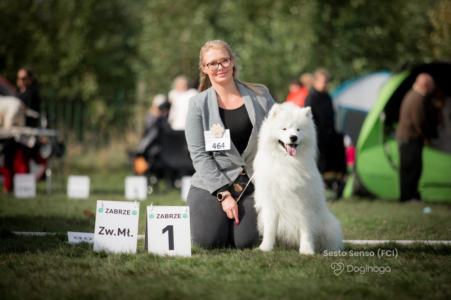 Na jednej z wystaw zobaczyłam psa. Urzekł mnie swoją puszystością, piękną, białą szatą i niesamowicie przyjaznym wyrazem pyszczka :) Okazało się, że to samoyed. Zaczęłam czytać o tej rasie i po cichu marzyć, że kiedyś stanę się właścicielką tej białej kulki :) Moje marzenie spełniło się w maju 2011 roku, kiedy rodzice podarowali mi w imieninowym prezencie KAYLE HONEY The Glow Of The Snowy Star. Moja radość była tak ogromna, jakbym wygrała w totolotka! Miałam swojego pierwszego, upragnionego psa! Kayla stała się oczkiem w mojej głowie. Idealnie do siebie pasujemy :) Kayla bardzo łatwo i szybko nawiązała relację z resztą psów i stała się wspaniałą kompanką dla Bernusi. Ich zabawom nie było końca, a my godzinami mogliśmy obserwować ich wygłupy :) Razem z Kaylą zaczęłyśmy pokazywać się na wystawach. Młodzieżowy Championat Polski Kayla ukończyła w ekspresowym tempie — już w wieku 11 miesięcy otrzymała odpowiednią liczbę nominacji, ku mojej wielkiej dumie i radości :) Samoyedy okazały się tak rewelacyjną rasą, że zapragnęłam mieć jeszcze jedną sunię — towarzyszkę dla Kayli. I tak w maju 2012 roku trafiła do nas Sonata Arctica EILEENA O’AZZIS. Eli, przeciwieństwo Kayli, jest istną oazą spokoju, która podbiła moje serce w mgnieniu oka. Mówi się, że po zakupie trzeciego czy czwartego psa pojawienie się kolejnych to już tylko kwestia czasu. U nas właśnie tak się stało. Psy okazały się pełnić w naszym życiu tak znaczącą rolę, dawać nam tyle szczęścia i radości, że zmieniliśmy bardzo wiele, aby móc dać im odpowiednie warunki do życia, otoczyć je stałą opieką i dać im tyle miłości, ile potrzebują :) Nie wyobrażam sobie już życia bez nich — i nie pamiętam nawet, jakie nudne musiało być ono wcześniej, zanim pojawiły się w nim psy!! :)