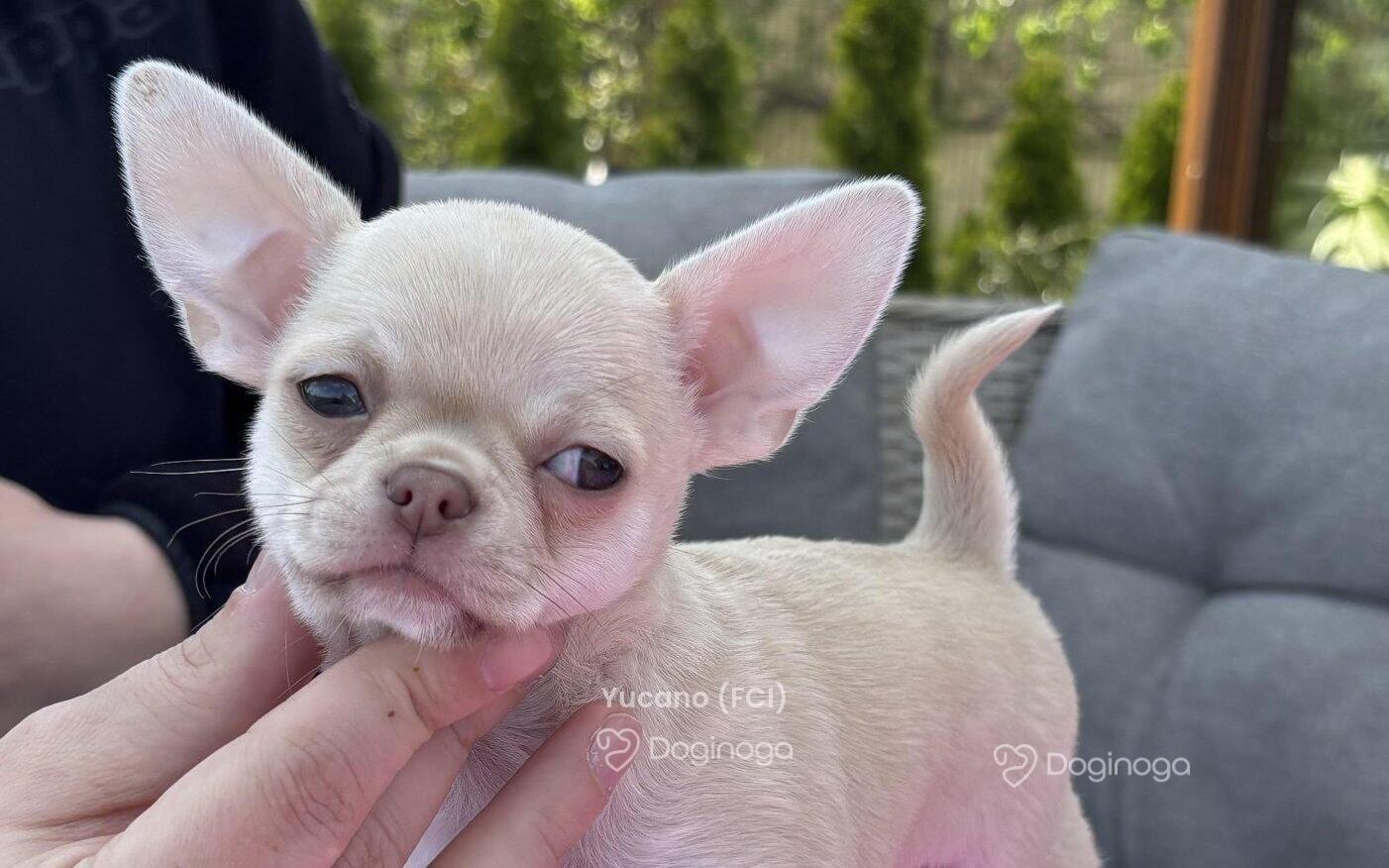 Chihuahua krótkowłosyBardzo wesoły, kontaktowy chłopczyk. Uwielbia psoty i zabawy z rodzeństwem, a także mizianki po brzuszku. Prawidłowo zbudowany, bez wad anatomicznych, o typowej, charakterystycznej jabłkowatej głowie. Chłopczyk rokuje wystawowo, ale równie dobrze odnajdzie się jako ukochany pupil na miękkiej podusi, u boku swojego nowego człowieka. Szczenię jest bardzo aktywne. Docelowa waga: około 2,8 kg. Po więcej szczegółów zapraszam do kontaktu.